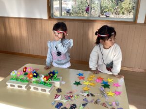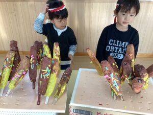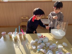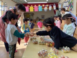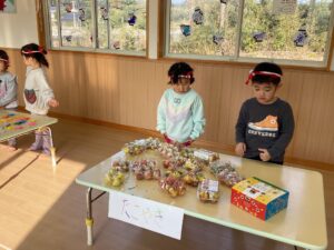 数か月前からくじらクラスでたくさんの種類のお祭りのお店作りを始め、1月16日に開催されました。 チョコバナナ・チョコレート・わたあめ・お花・りんご飴などなど色とりどりの可愛いお店が出店され 全クラスお買い物に参加して大賑わいでした。 「いらっしゃーい♪いらっしゃーい♪」と元気な声がよく響いていましたよ。